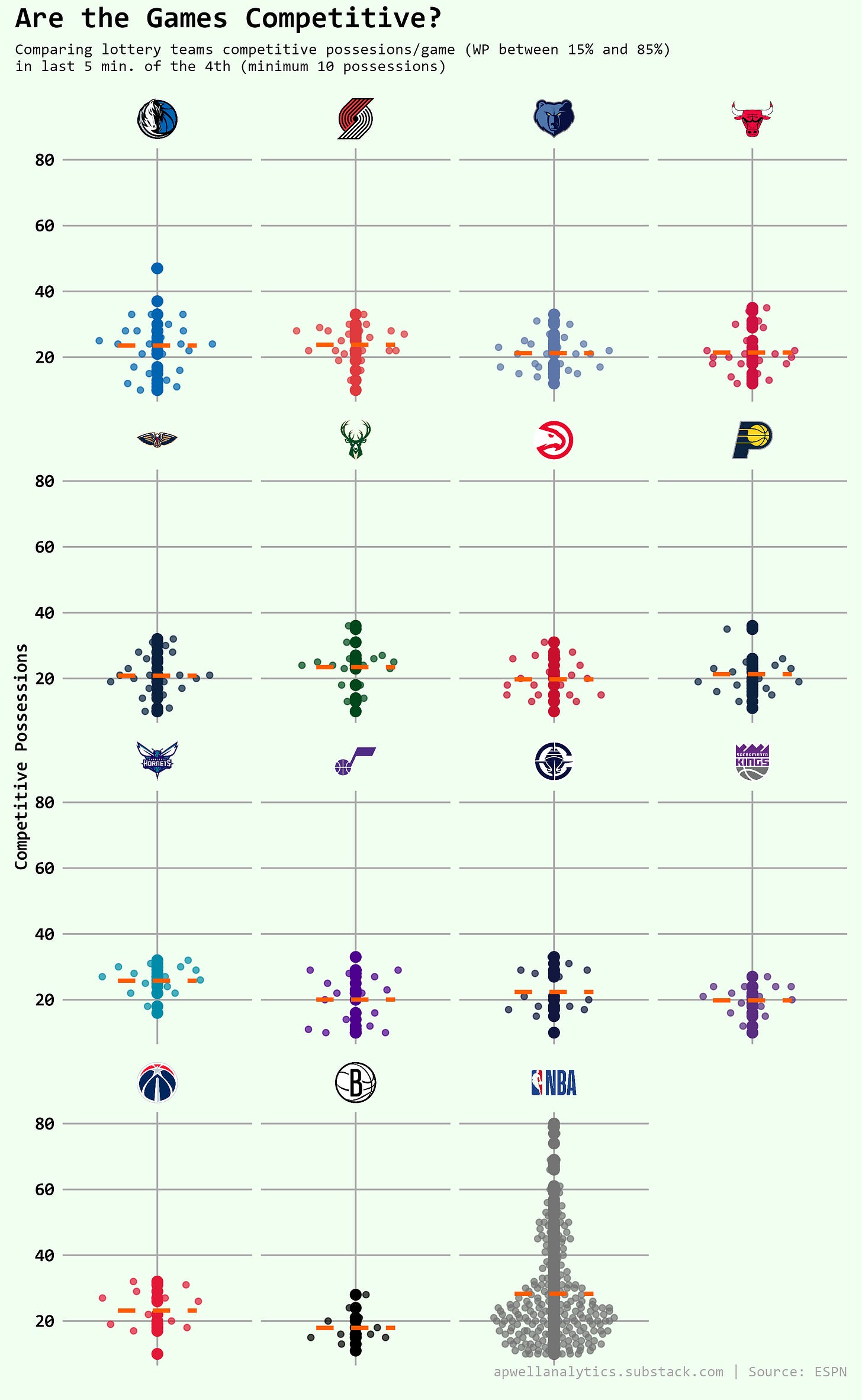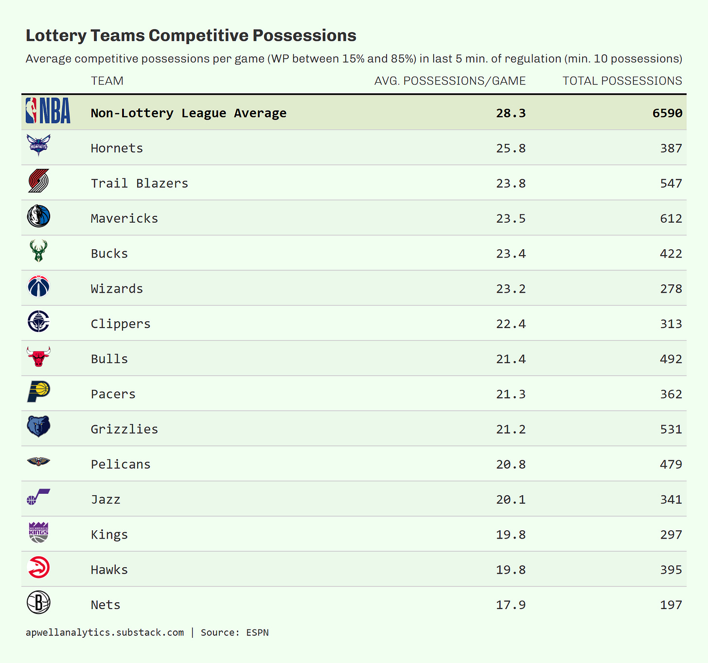 Analyzing lottery teams’ average competitive possessions to other lottery teams and the non-lottery league average helps filter out lottery teams that are actually uncompetitive. The non-lottery teams averaged 28.3 competitive possessions per game.