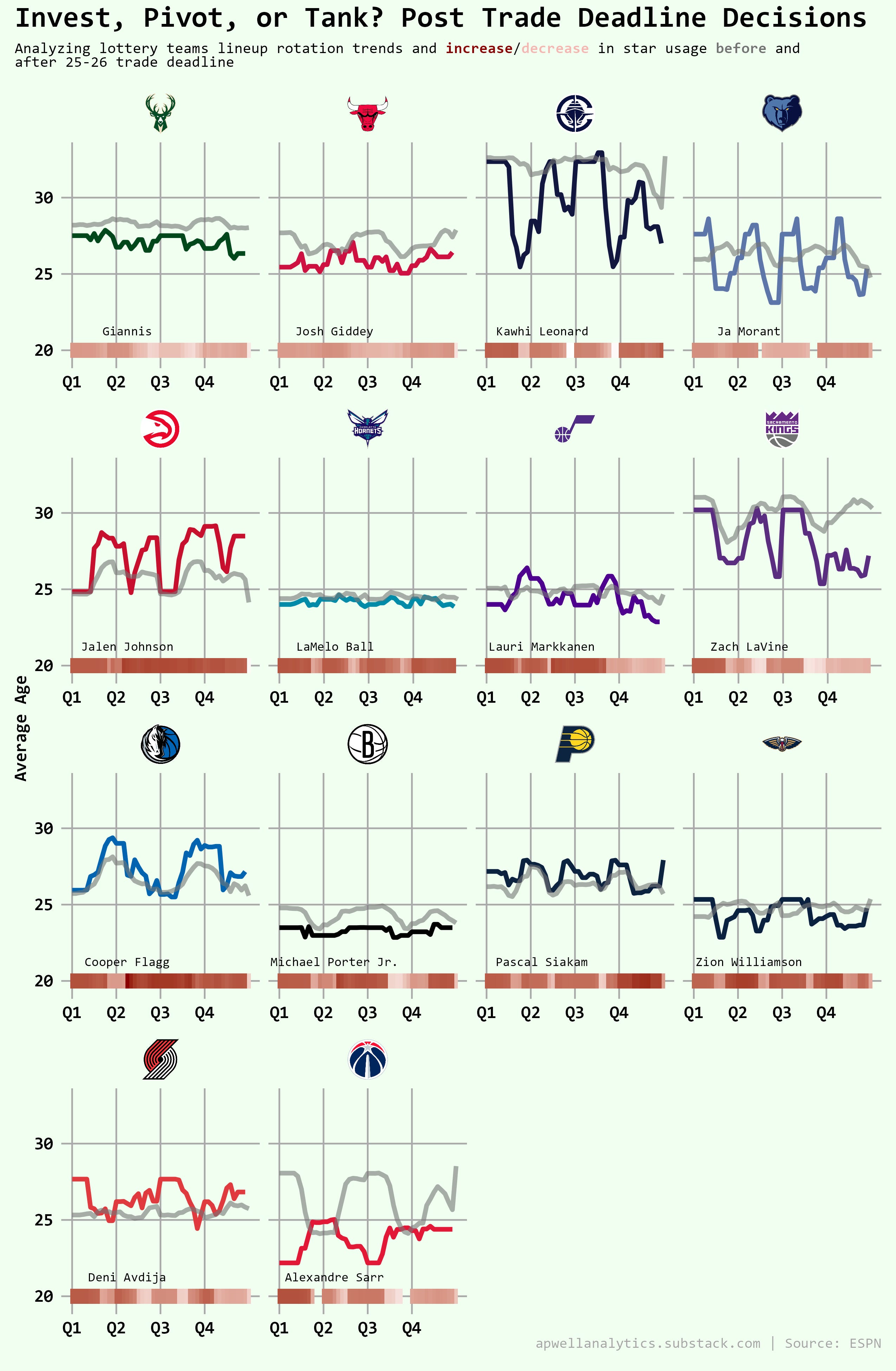 The Jazz are the most obvious tanking team. Though they have a young team in the midst of their rebuild weighing down the rotations’ age, and have made trades to acquire a proven player in Jaren Jackson Jr., they are the lone team holding out their star player in multiple games for non-injury reasons. The heatmap for the Utah Jazz in the “Invest, Pivot, or Tank? Post Trade Deadline Decisions” plot shows that post trade deadline, the Jazz are not playing the player that gives them the best chance to win for most of the 4th quarter. This is why they got fined. Not to mention, they shut down Jaren Jackson Jr. for the rest of the season after getting fined for not playing him along with Lauri Markkanen in the 4th quarter.