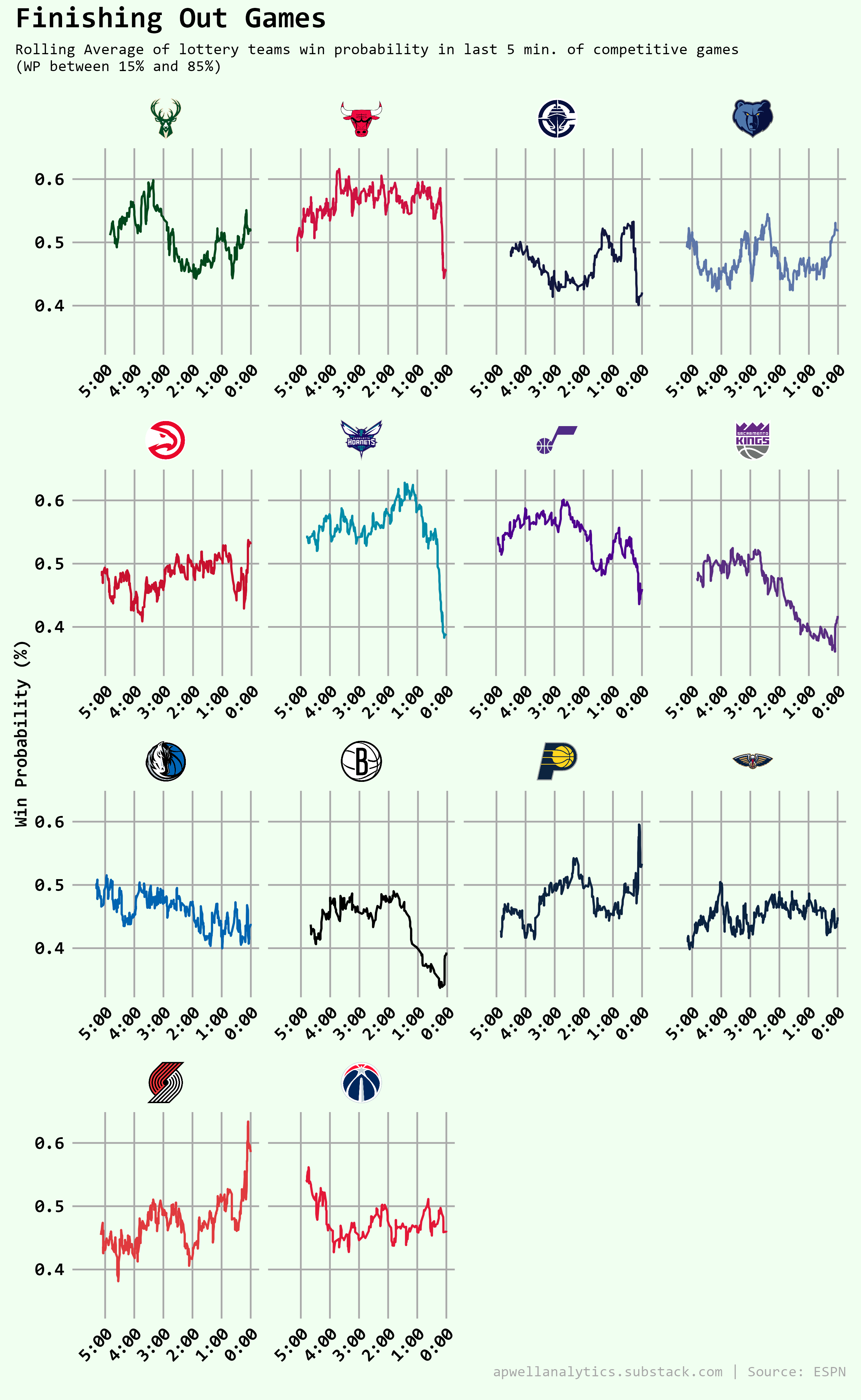 The Bulls own their first-round pick in 2026 and seem to be fairly competitive throughout their final 5-minute stretches. The Bulls started the year hot and have settled back into mediocrity as the year continued. It should be noted that injuries have been a contributing factor to their play. The sharp decline in win probability in the final seconds of the game, in combination with their relatively competitive win percentage of the proceeding 5 minute stretch hint more at an inability to win close games than deliberately losing games.